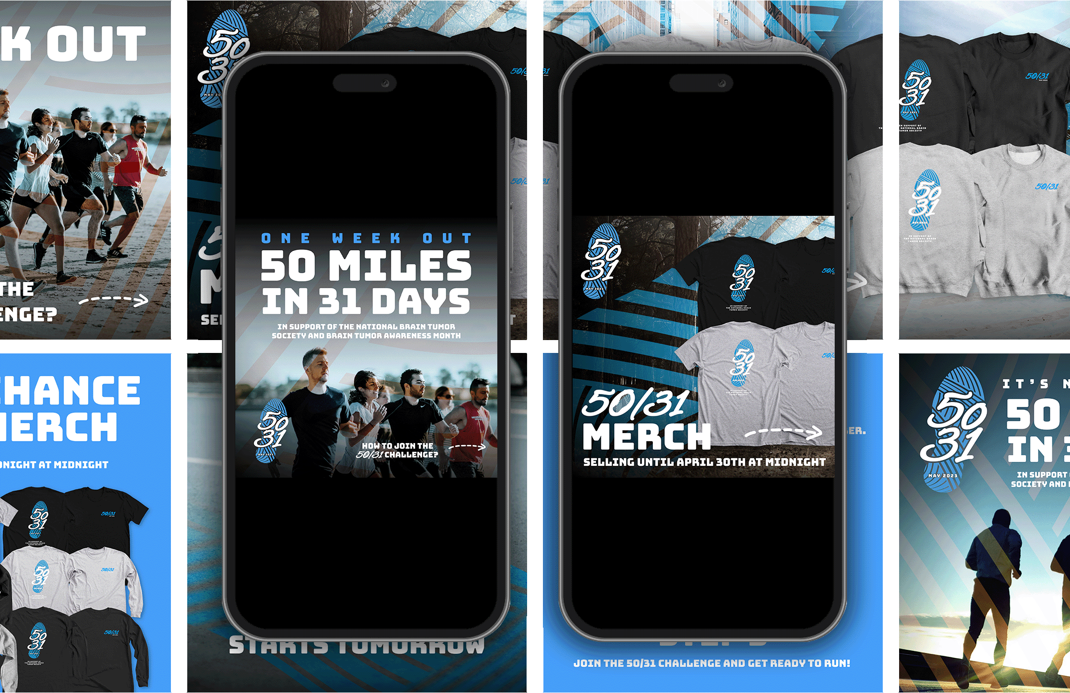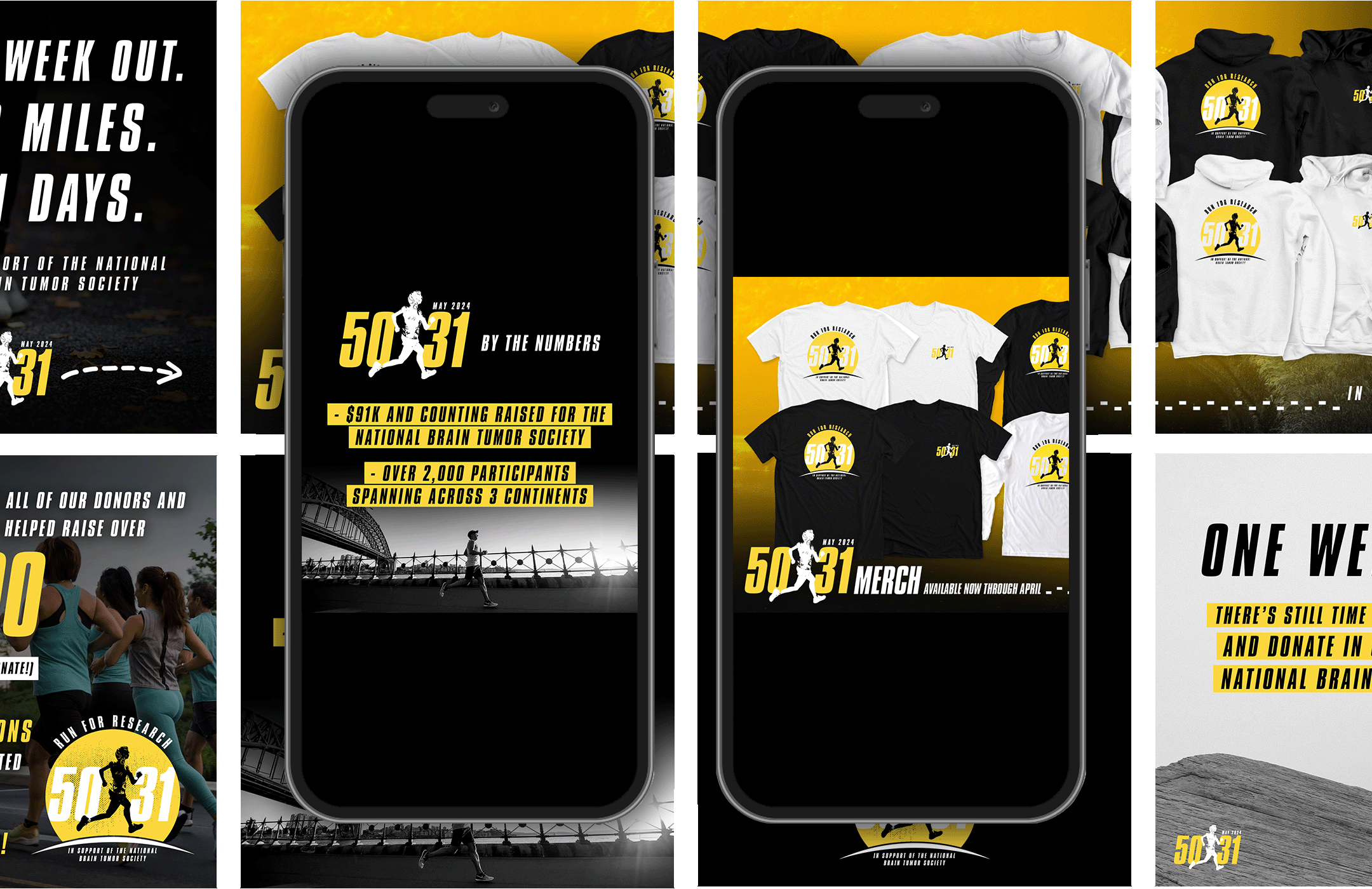 The 50/31 Challenge is an annual fundraising event supporting the National Brain Tumor Society—50 miles run across 31 days. I was brought in to create not just the logo, but also the visual identity for both 2023 and 2024 that would live through organic social and merchandise.