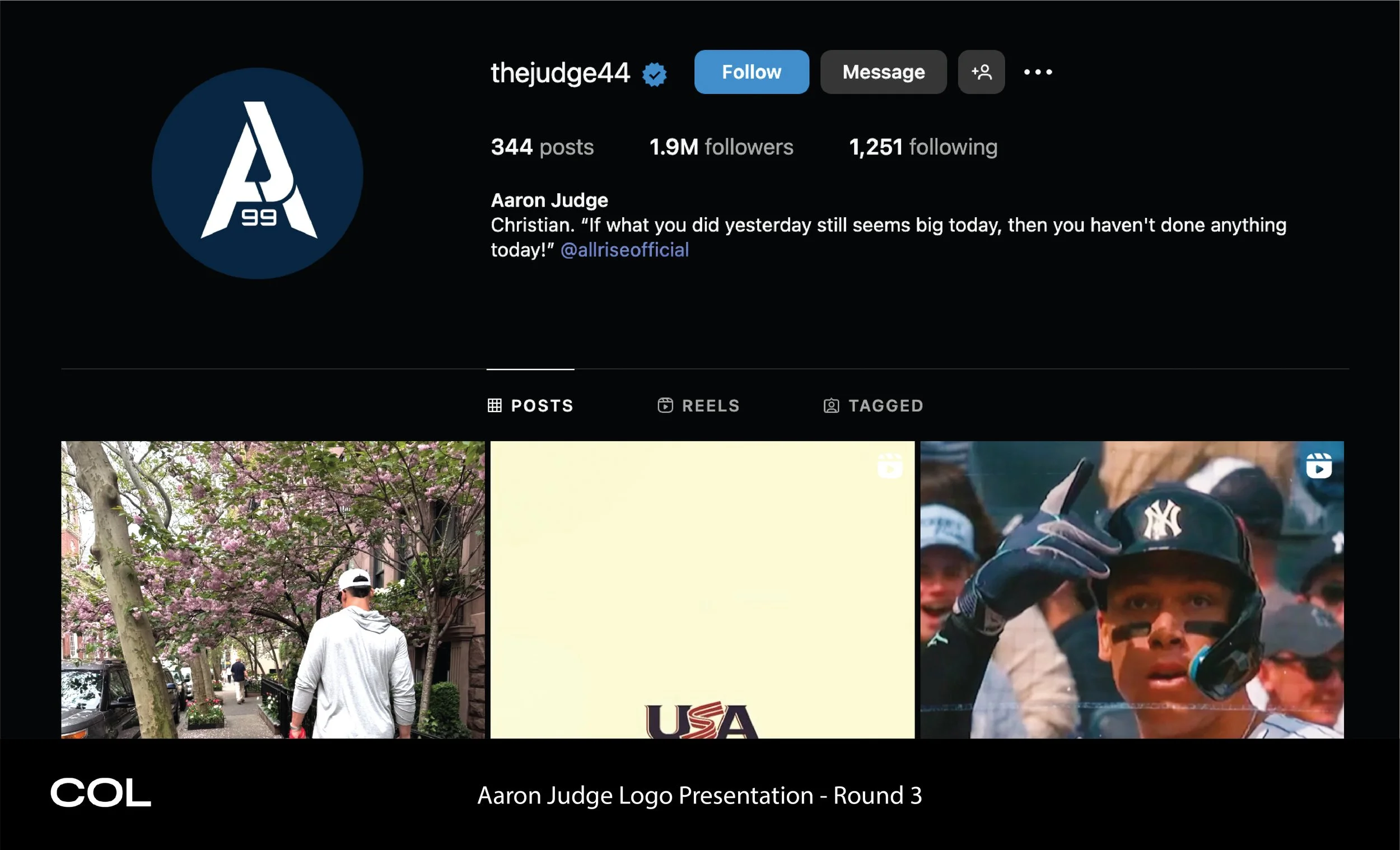 Aaron Judge is a preeminent figure in sports. His stats and record breaking seasons speak for themselves, however it is also important to keep in mind one’s brand and how they portray themselves on and off the field. Known for being a tremendous athlete, and having a stellar reputation with his teammates and fans, Aaron Judge needed a logo that would effectively uphold these values and communicate his prowess in any and all of his brand executions.